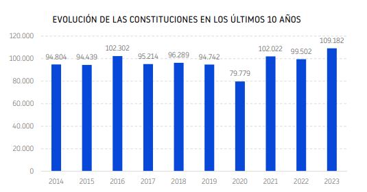 En 2023, la cifra de constituciones se incrementa casi un 10% con respecto a 2021. Se han constituido un total de 109.182 empresas según el análisis de los datos de INFORMA. La cifra total de empresas creadas en 2023 es la cifra más alta de los últimos 10 años, seguida de 2021 y 2016 en los que también se superaron las 100.000 empresas constituidas.